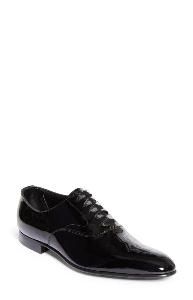 Add an elegant flourish to a formal look with this tapered-toe oxford crafted in the UK of patent leather and finished with grosgrain laces.